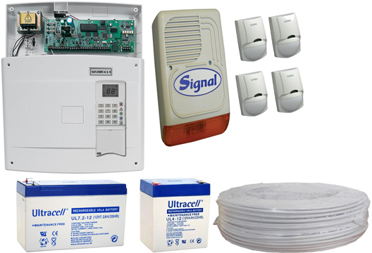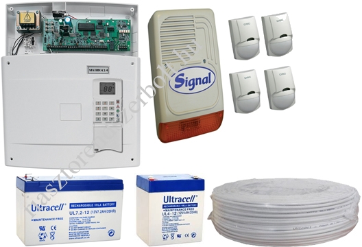 Ez a rendkívül jó minőségű PYRONIX MATRIX riasztórendszer kompletten tartalmaz mindent, ami egy megbízható riasztórendszerhez szükséges. - 1 db Pyronix MATRIX 6 6 zónás riasztóközpont (nem bővíthető). - 1 db Pyronix MX-LCD Ikonos kezelő. - 1 db Pyronix MATRIX6FD fémdoboz, 16VAC/20VA tápegységgel. - 4 db Passzív infra mozgásérzékelő, (árkülönbözettel más infrára is cserélhető). - 1 db SIGNAL PS128 kültéri hang-, fényjelző (árkülönbözettel más szirénára is cserélhető). - 1 db 7Ah/12V és 1db 4Ah/12V akkumulátor (központba és szirénába). - 100 méter 6 x 0,22 kábel, sodrott erek, alufólia árnyékolás, fehér PVC köpeny, tűzálló.