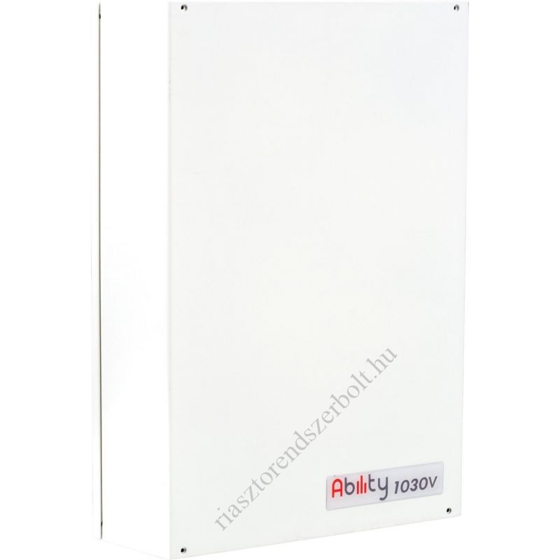 Ability 1030B behatolásjelző központ;- 5 terület;- 10-30 zóna (duplázható);- 1 riasztási relé;- 2 OC kimenet;- beépített kommunikátor;- max. 20 felhasználó;- max. 50 kulcs;- 250-es eseménymemória;- memória 20db, összesen 60s beszédüzenet számára telefonos jelzéshez;- 1,3A-es tápegység,- fém doboz