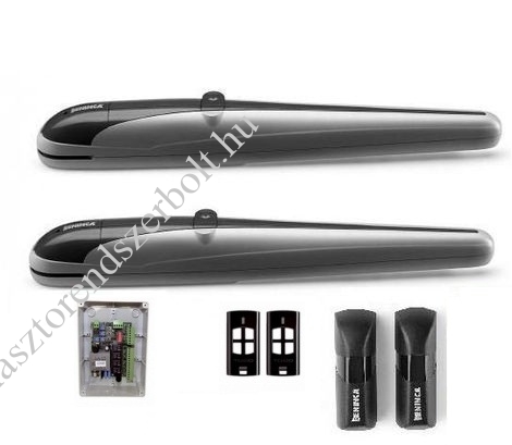 BENINCA Kit Bob5 szárnyaskapu mozgató szett kétszárnyas kapukhoz. Maximum 5 méter / szárny, maximum 350 kg / szárny. 2db BOB50M 500mm löketű motor, 2db TO.GO4 adó, ECO2 vezérlő, 1 pár Pupilla fotocella, max 5m/szárny, max 350kg/szárny, 30% munka, gyalogos bejáró funkció, lassítás, 2300N, 230Vac