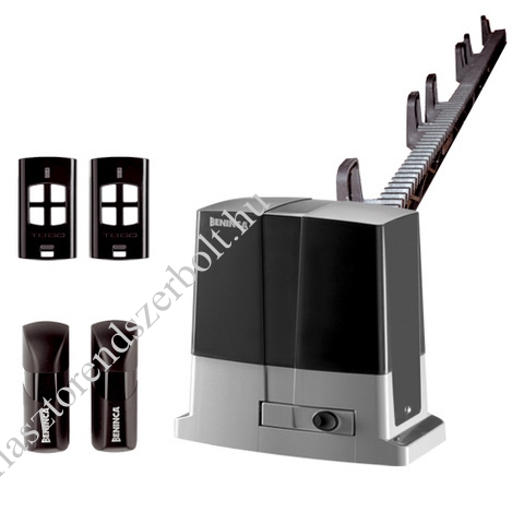 BENINCA - Tolókapu mozgató szett, max 500kg kapusúly, 30% munka, beépített vezérlőegység integrált rádióvevővel, 2db 4 csatornás TO.GO4 adó, 1 pár PUPILLA fotocella, 230Vac, gyalogos bejáró funkció, lassítás funkció, kulcsos kioldás, esztétikus kivitel 4 méter CRV6 fogasléccel !!!