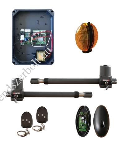 PROTECO - 230V, Orsós kapumozgató kit kétszárnyas kapukhoz, 2db Leader motor jobbos és balos, 500 mm löket, max 3,5m-es kapuszárnyakhoz, Q60RA vezérléssel, fixkódos rádió vevővel, 2db 3 csatornás rádióadó, 1db villogó, 1pár fotocella. Családi házakhoz, óránként 4-5 nyitás, kiskapu funkció, lassítás, közepes súlyú (200-300kg) kapuszárnyakhoz, 2 év garancia
