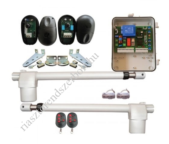 EUROMATIC orsós kapumozgató kit, GARDENGATE kiegészítőkkel kétszárnyas kapukhoz, 2db 230Vac TECHNO300 motor, jobbos és balos, 300 mm löket, max 2mes kapuszárnyakhoz, TWIST vezérlés beépített ugrókódos rádióvevővel, 2db 4 csatornás rádióadó MASTER ROUNDQ, 1pár fotocella FOTOMOUSE, családi házakhoz, óránként 4-5 nyitás, kiskapu funkció, közepes súlyú (200-300kg) kapuszárnyakhoz, 2 év garancia