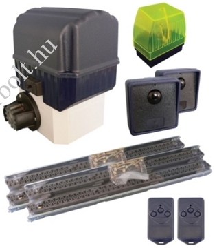 EUROMATIC - tolókapu kit, 1db LASER5 tolókapu motor, 1db Q60S vezérlés, beépített fixkódos 434 Mhz rádióvevővel, 2db PTX3E1 3 csatornás rádióadó, 1pár RF31 fotocella, 1db TCLAMP-G 24 V/10 W figyelmeztető lámpa, 4m műanyag fogasléc, végállás kapcsolók, összeszerelő kit, - Családi és társasházakhoz, 30% munka, kiskapu funkció, 500kg-os kapuhoz, 2 év garancia