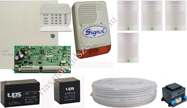 DSC1616 központ+5516 led kezelő, doboz, táp, 2db akku, 4db érzékelővel, 100m kábel.